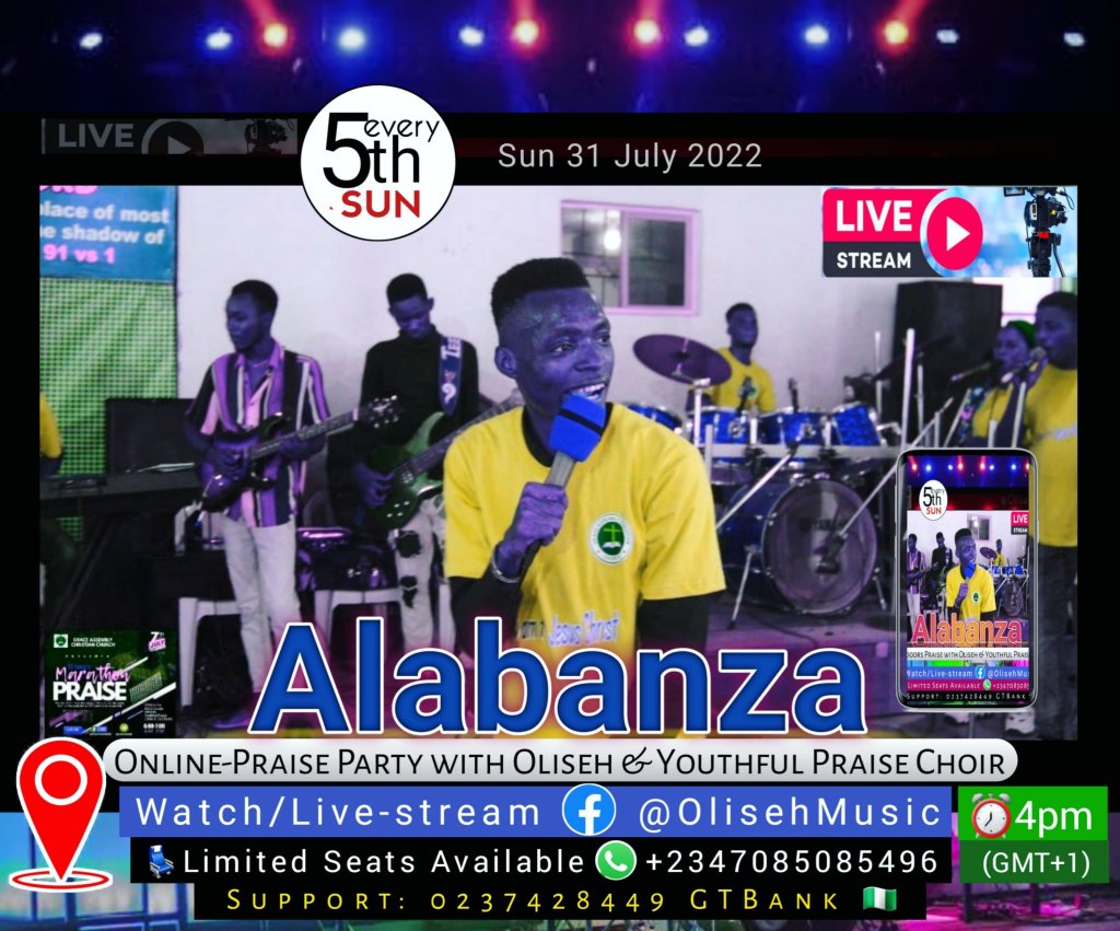 ALABANZA 🔥 Youth Praise Party on Facebook and Telegram with Oliseh and Youthful Praise Choir. Watch on your phone (facebook), or listen live (Telegram) on Sunday, 31st July 2022. 4pm (GMT+1). Venue: Video (Facebook) | Audio (Telegram) 🇳🇬🇺🇬🇺🇲